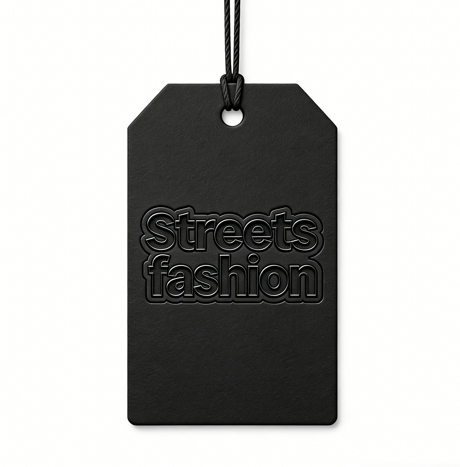 This Streets fashion hangtag is crafted from matte black specialty paper,